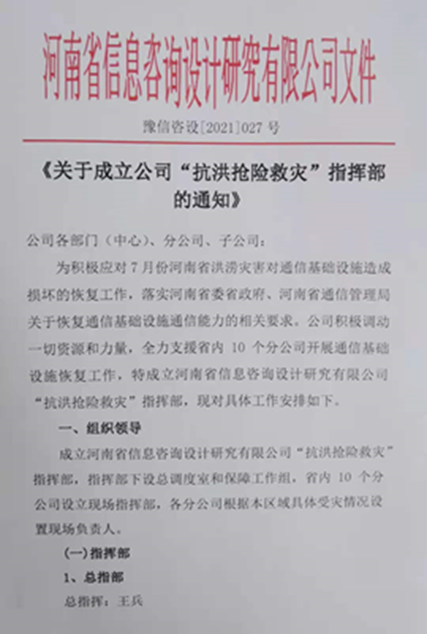 自7月19日河南發(fā)生嚴重汛情以來,河南省信息咨詢設計研究有限公司(以下簡稱設計院)認真貫徹落實習近平總書記防汛救災重要指示精神,按照河南省委、省政府和河南省通信管理局部署,第一時間響應《應急通信保障調度令》救災搶險安排,迅速成立“抗洪搶險救災”指揮部,安排部署防汛搶險工作,全力確保防汛通信搶險工作緊張有序進行。